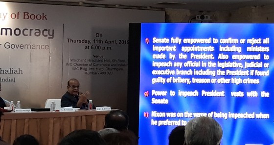 Then talking about the advantages of presidential democracy, he stated that this itself will avoid all types of corruption and infighting that we witness today , with unhappy people changing the parties. This 320 page book also contains -beautiful caricatures and many more interesting observations . It is priced @ Rs. 590/- and is available on Amazon. Published  by Forum for Presidential Democracy in association with Notion Press Publishing , Mumbai.