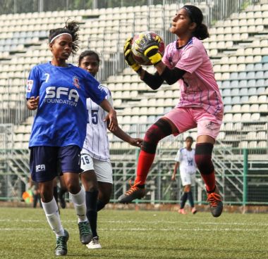 Next Sports Academy goalkeeper Diya Patel (right) leaps to collect the ball to deny Amma FC attacker Punam Kumari from getting to the ball during their WIFA Women’s Football League .