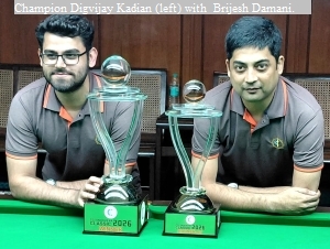 Digvijay, constructed breaks of 88 (2nd frame), 67 (3rd frame), 91 (6th frame) and 37 (8th frame) as he went on to record a 55-59, 88-17, 77-1, 83-73, 76-36, 92-0, 62-53, and 95-0 win for his maiden senior title. He went home richer by Rs 3.5 lakhs, while Brijesh received a cheque of Rs 1.75 lakhs. The two losing semi-finalists, Shahyan Razmi and Pasas Gupta got a purse of Rs 80,000 each.