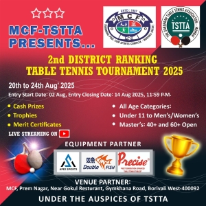 The MCF-TSTTA 2nd District Ranking Table Tennis will be played between 20th August to 24th August 2025, at MCF, Club, Borivali. Last date for submission of entries is 14th August 2025 till 11.59 pm. There will be total 18 events, starting from U-11 Boys and Girls till 40+  & 60+ categories in Men’s and Women’s groups.