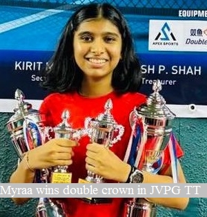 Myraa Sangelkar, hardly 15 years old , of late has been in roaring form this season  as she bagged girls under 17 as well under 15 finals in the in the 5-Star TSTTA District ranking table tennis tournament,  organised by  Juhu Vile Parle Gymkhana at their table tennis hall recently.