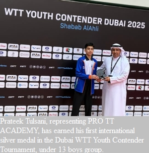 Prateek Tulsani, from  PRO TT ACADEMY, has earned his first international silver medal in the recently concluded Dubai WTT Youth Contender Tournament, in  under 13 boys group. While Congratulating Prateek Tulsani on this achievement, his Coach Raju Sawant  has extended his gratitude to DANI SPORTS FOUNDATION for their financial support.