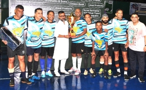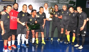 The victorious Maccsbi FC ‘A’ players winners of theWCG Men’s Veterans title are seen posing with their trophy along with Chief Guests, Capt. Pradeep Correa and Warren Pinto.
