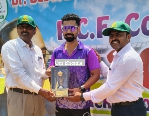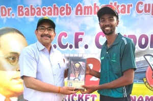 Chief Guests, Jai Bhagwan Sharma (left), ED (Legal Admin Medical), RCF, and Dr. Unmesh Khanvilkar, Hon. Secretary, MCA present Om Bhosale (DMCC) with the Man of the Match award.